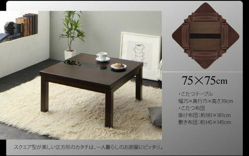 ◆こたつテーブル単品:こたつテーブル《こたつテーブル》■75 75 cm【サイズ】幅75 奥行75 高さ39cm【製品重量】17kg【梱包サイズ/重量】81 90 16cm / 18kg■全サイズ共通【天板耐荷重】約20kg【材質】プリント化粧繊維板、ラバーウッド、MDF、5mm強化ガラス 仕上げ:ウレタン塗装【カラー】ウォールナットブラウン ブラック【ヒーター】 正方形(75 75) :300W石英管ヒーター 長方形(75 105)・(80 120):510W石英管ヒーター いずれも中間スイッチ式【電源コード長さ】約3m【梱包数】1【生産国】ベトナム【備考】ヒーター部メーカー1年保証付き ※組立品※商品のサイズ・重量は概算です。