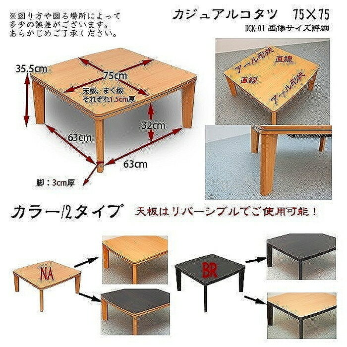 商品説明(spec等)サイズ正方形:W750xD750xH355mm(梱包サイズ:W830xD830xH120mm)本体重量:16kg(梱包重量:17.4kg)幕板下高さ:320mm天板:15mm厚幕板:15mm厚素材■素材・成分:天板・幕板:PB使用 ビーチPVC貼り脚:MDF使用 ビーチPVCラッピング使用75幅ヒーター:400W石英管ヒーターカラーブラウン・ナチュラル送料全国一律無料(沖縄、離島は配達不可)商品説明■組立式(約15分/付属の六角レンチにて組立)1梱包■生産地:インドネシア※写真の色調はモニターの機種や設定により実際の商品と異なる場合があります。