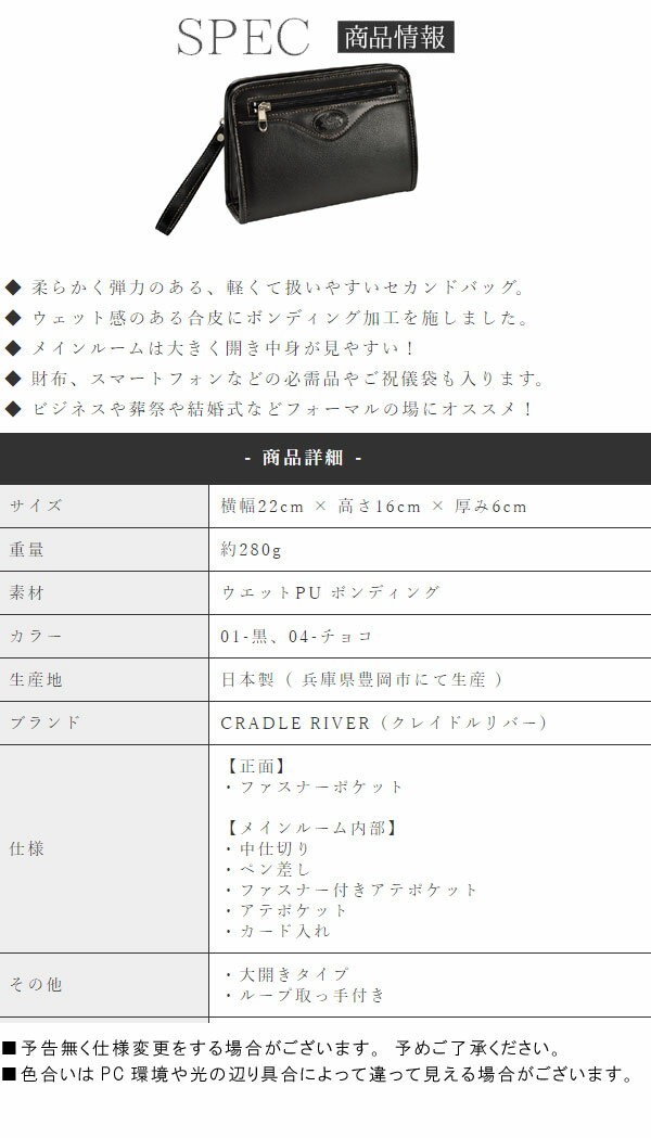 + 商品仕様 + クレイドルリバー/ビジネスシリーズ ウエット合皮メンズセカンドポーチ 22cmサイズ No.25620 ■サイズ:22×16×6cm ■重 量:約280g ■カラー:黒・チョコ ■素 材:ウェットPUボンディング ■構 造: ●大開きタイプ ●正面:ファスナーポケット ●本体内部:中仕切り、ペン差し、ファスナー付アテポケット、 携帯ポケット、カード入れ ■日本製 豊岡製 Made in Japan ※色合いに関してはPC環境や光の当たり具合により異なって見える場合がございますが予めご了承ください ※注意事項等がございます。